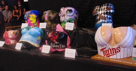 Each of the casts had been created by (and most of them decorated by) one of ten roller girls in attendance. The busts were created for breast cancer awareness, and were being auctioned off during halftime. On the bottom right, you can plainly (plainly!) see the “pair” that I had also seen linked to in the newspaper article on Facebook.