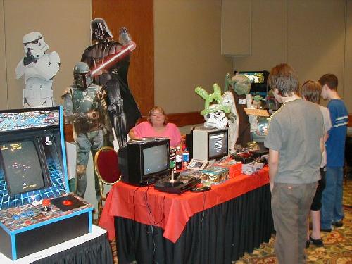Since I didn’t want to become known as “the pirate guy”, in 2005 I decided to show off my Star Wars collection instead. That year I set up several consoles including the Atari 2600, Super Nintendo, Xbox, Gamecube and had Star Wars games playing on all of them. Along with the games I brought several Star Wars items from my personal collection, to complete the theme. I also brought my wife to help me run the table — she was nine-months pregnant at the time, and OVGE was held on our baby’s due date. Fortunately no one’s water broke at the show, and Morgan was born a week later.