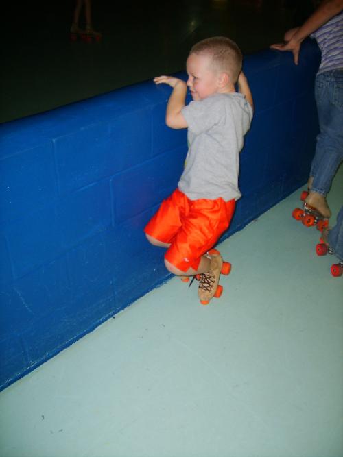 Mason skated in the practice area for a while and then decided to tackle the big rink. He started working his way around the wall, falling every two feet or so. Halfway around the lap a referee took mercy on him and helped him back over the beginners area once again.