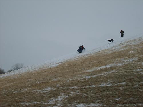 Mason and Daddy sliding at top speed, being chased by a dog.