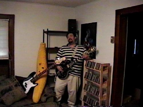 The legend of Mr. Moonpie took on a life of its own. Yaun-Ti (the ringleader of TBH405) drew pictures, wrote songs and crafted stories about Mr. Moonpie. As digital pictures became a reality, I slowly began leaking pictures of the real Mr. Moonpie (the stuffed banana) to the public. In 1996 I even made a movie starring Mr. Moonpie and myself. The film featured several short parody skits. (I’m pretty sure I have the only copy of said film.) On IRC (#405) I created a Mr. Moonpie bot that people could chat with (and get abused by). For a short period of time I even started rumors that Moonpie and I were starting a band, and leaked pictures like the following: