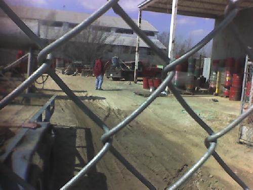 Upon our arrival we found a guard dog and lots of sand, but no people. The dog was particularly friendly and completely unmenacing. We could hear someone sandblasting off in the distance; obviously, they could not hear us. After walking around for a few minutes, Johnny headed back toward the source of the noise while I stayed up front.