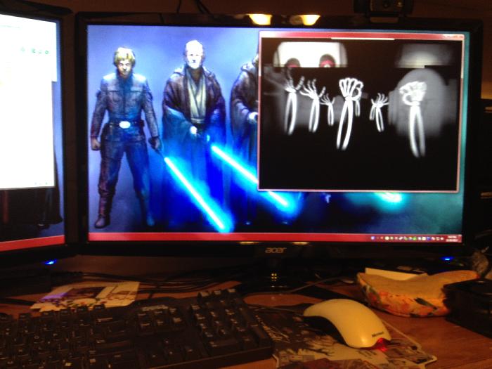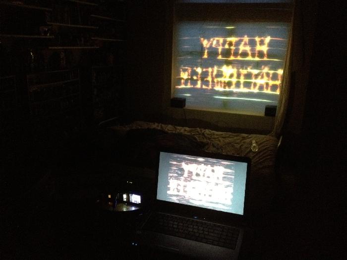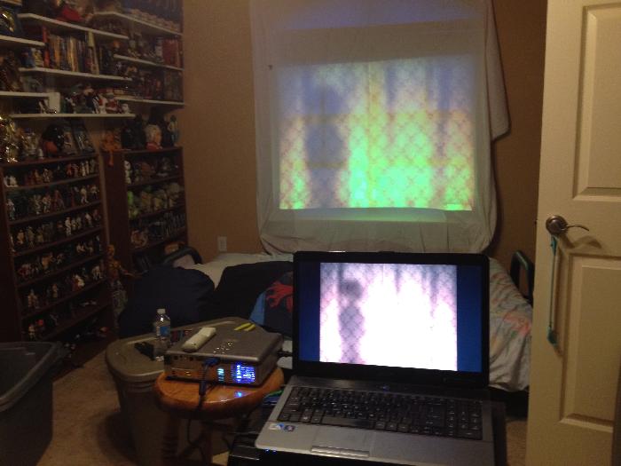 This is the setup from inside the house (in my Star Wars room, no less). I purchase the digital download versions of Mark’s videos, but you can also buy them on DVD. Since I use the digital versions, I play them on my laptop using VLC and route the video out to a projector. In front of the window I hang a white sheet. The main video montages come in both “regular” and “reversed” formats. If you’re doing rear projection (like I am), you’ll want to run the reversed video clips. (Or, you can mirror-flip the videos in VLC as well.) VLC also has the ability to use and loop a playlist, so that’s what I do. (Protip: dig down in the video settings and you can turn off the displaying of the file name whenever a new video starts!) The only thing you can’t see in this picture is I am routing the audio from my laptop to a stereo tuner and out to two small speakers that I have placed in the window sill.