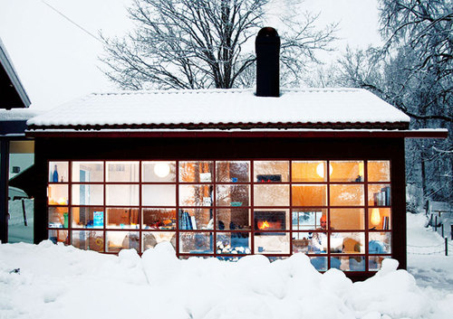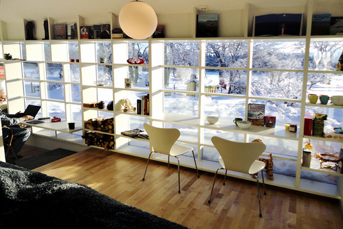 These Swedish shelves not only take up an entire wall, but allow the home owners to still see out through the windows! I wouldn’t store any collectibles that might fade in directly sunlight on them, but for glassware, books, and other household items, I think they’re pretty wizard!