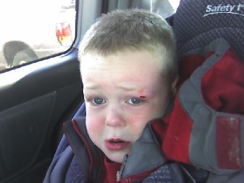 Here’s a shot of Mason in the car, a bit scared. This is before his eye really started swelling.