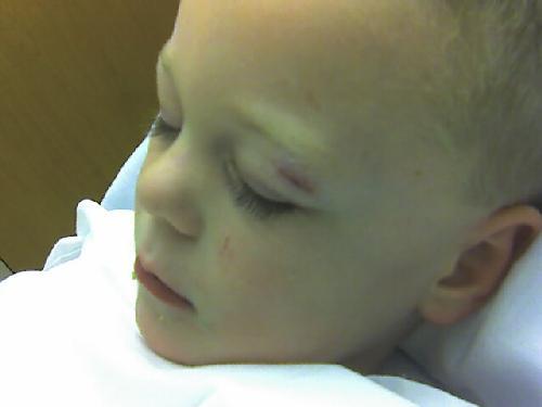 After the swelling went down the doctor determined he could use “DermaBond” (?) instead of stitches. DermaBond is essentially Super Glue, which works just like stitches. The doctor said that he’ll have a scar after it heals, but most likely it’ll just end up looking like a wrinkle.