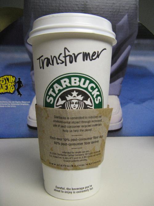 This picture proves two things: one, that my wife and Emily are funnier than I give them credit for, and two, that Starbucks will write down any name you give them on your cup and announce it loudly to the lobby when your purchase is ready. Attention Transformer, your cappuccino is ready!