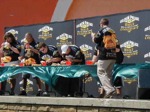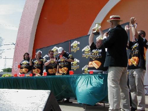 They were on hand for the IFOCE (International Federation of Competitive Eating) sanctioned Grilled Cheese eating contest. The contest we watched pitted five local radio DJ’s against each other. The rules of the contest were to see how many grilled cheese sandwiches these guys could eat in five minutes. The first one to nine wins.