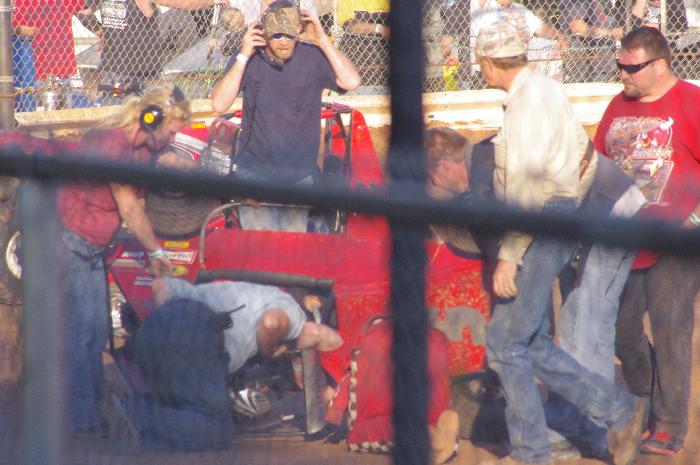 The kid was alright, even though his kart was dead and had to be hauled off by a 4-wheeler. I was actually less worried about the kid (who was wearing a helmet) than I was for his mother who ran out on the field carrying a new born baby, although I must admit I’ve been out on the basketball court a time or two whenever my kids go down.