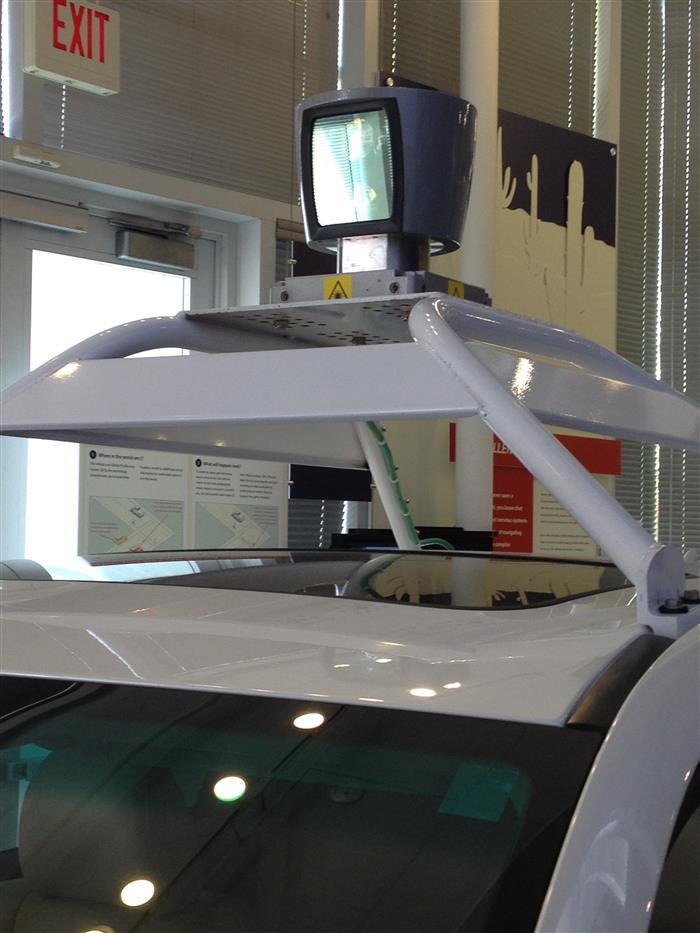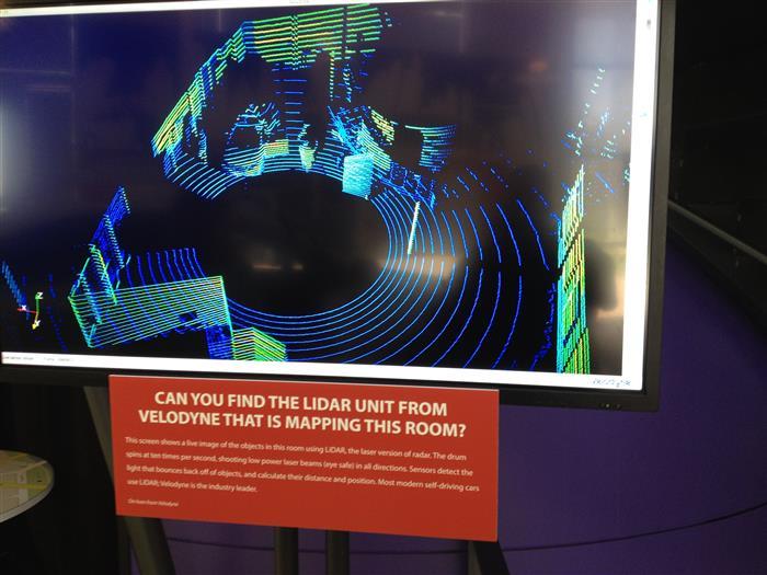 I suppose if you can afford to design and build a self-driving car, you might as well do it in a Lexus SUV, as you see here. None of my pictures of the inside of the car came out very well, but other than a small computer module mounted to the dash and a big red panic button on the center console, it looks pretty much like the inside of every other Lexus SUV. The car begins with a detailed map of the area in which it will be driving (think: super detailed Google Map). That’s the “known”. Then it discovers the “unknown” (cars, traffic lights, people) using a LIDAR system mounted to the top of the car.