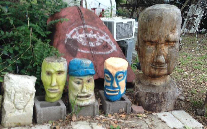 Hanging off the Bridge to Nowhere are painted drop cloths. I tell Ron that they remind me of sideshow advertisements and he says that’s the look he was going for. The farm just finished hosting its second annual “Tarot Time” event, sponsored by a local psychic and Ron’s wife who provided Tarot card, spirit, and aura readings. I begin to ask more about the event but we’re already climbing down off the Bridge to Nowhere and starting to look at Ron’s chainsaw carvings, of which there are many.