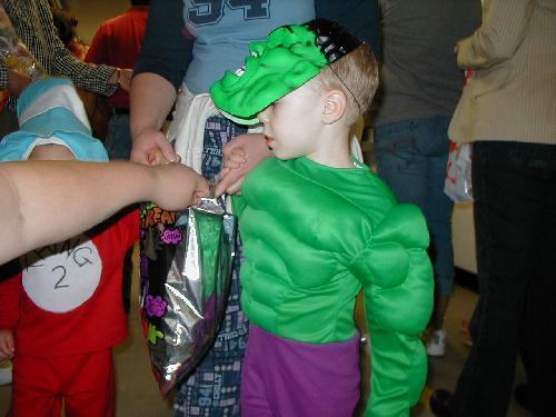 The kids just got done trick-or-treating the tunnels here at work. Mason made out like a bandit, just like last year. Halfway through the tunnels he dumped his plastic pumpkin candy jug into another sack, so he could get even more goodies. Man, they learn fast.