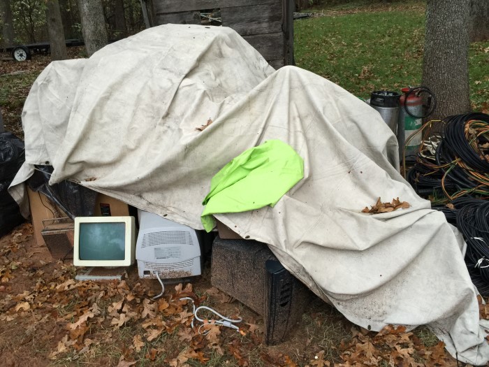 Multiple CRT computer monitors peeked out from beneath the tarp. Everything under the tarp had been placed directly on the wet ground, and with the tarp flapping in the wind, most of the items were now soaked.