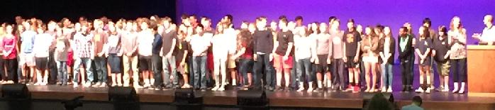 Last month I attended an awards ceremony at Mason’s school, where Mason is one of 550+ eighth graders. For each subject, all the school’s teachers took the stage and handed out certificates to their star students — somewhere between five and ten students per teacher. Each student was called by name to walk up to the stage and accept his or her certificate. There were probably fifty kids on stage by the time all the math teachers had presented their awards. Then they moved on to science, history, English, Spanish, French, the vocal and drama departments, and so on before moving on to things like the Model UN, journalism, the academic bowl, and other school sponsored activities. Even if your kid hadn’t been on stage yet — no child left behind, right? — they still had a shot at the academic awards, in which every kid with a 3.5 average or better (A’s and B’s) received one. Toward the end, they hand out awards for going to school every day. Here’s a picture I took (from the back row, sorry) of some of our special snowflakes on stage:
